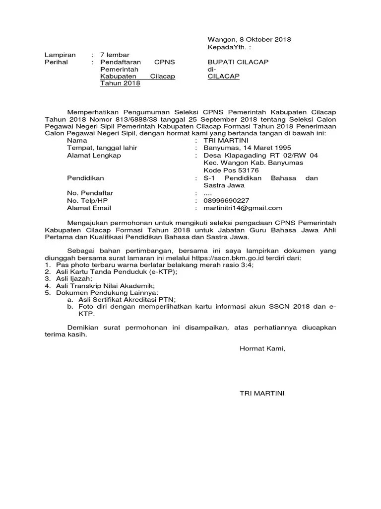 Surat Lamaran Cpns Kabupaten Cilacap 2021 / Revisi Contoh Format Surat Lamaran Formasi Eks K Ii Disabilitas Umum Dan Cumlaude Bkpsdm Kab Sampang / Kantor kesehatan pelabuhan kelas ii cilacap.